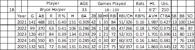 Harper has been in Major League Baseball for 14 seasons, but he has never been the best player in any of those years. His bat peaked in 2015 (.330/118/42/99/6 over 521 at-bats). Harper has three other seasons with at least 30 home runs (2018 – 34, 2019 – 35, 2021 – 35, and 2024 – 30).