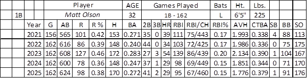 Olson was a better player against left-handed pitching (.281/22/6/30 over 196 at-bats). Over his final 270 at-bats, he hit .289 with 46 runs, 12 home runs, 37 RBIs, and one steal.