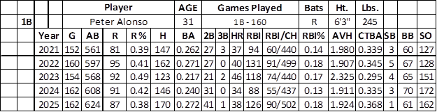 Alonso has had a high floor in RBI chances over the past four seasons (440, 499, 440, and 437), and it could fall at the high end of that range by hitting behind Juan Soto (on base 299 times last season) if he resigns with the Mets.