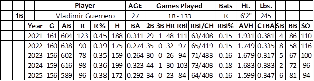 For the fourth consecutive season, Guerrero failed to approach his breakout power year in 2021 (.311/123/48/111/4 over 604 at-bats). He continues to have a high floor in plate appearances and games played, which should create more RBI chances (over 400 in each of the past five seasons). On the downside, his average hit rate (1.599) in 2025 was a five-year low, highlighting the direction of his power (AVH – 1.931 in 2021).