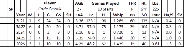 His average fastball (96.2 mph) aligned with his previous career path. Cavalli features a high volume curveball (.351 BAA), supported with a four-seamer (.258 BAA), sinker (.310 BAA), changeup (.222 BAA), and cutter (.200 BAA). He struggled with right-handed batters (.381 BAA over 84 at-bats with 14 runs and three home runs).