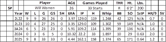 Warren flashed over his first two seasons in the minors (19-13 with a 3.69 ERA, 1.264 WHIP, and 283 strikeouts over 263.1 innings) despite issuing 101 walks (3.5 per nine). His arm lost its way over 23 starts at AAA in 2024 (5.91 ERA, 1.395 WHIP, and 136 strikeouts over 109.2 innings), followed by failure with the Yankees (26 runs, 43 baserunners, and five home runs over 22.2 innings with 29 strikeouts).