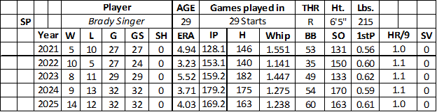 Since his breakout season in 2021 (10-5 with a 3.23 ERA, 1.141 WHIP, and 150 strikeouts over 153.1 innings), Singer went 31-36 over his last 93 starts with a 4.39 ERA, 1.316 WHIP, and 466 strikeouts over 509.0 innings. His walk rate (3.2) was a four-year high, with a slight bump in his strikeout rate (8.6).