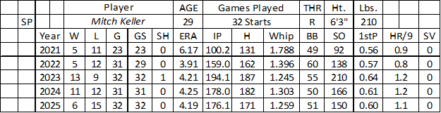 The Pirates gave Keller 147 starts over the past five seasons. Unfortunately, he went 40-59 over this span with a 4.40 ERA, 1.358 WHIP, and 756 strikeouts over 808.1 innings. His arm flashed strikeout potential (210 over 194.1 innings) in 2023, but his strikeout rate drifted into the soft-tosser range last year (7.7 per nine). Keller showed better command (2.6 walks per nine) over the past three seasons.