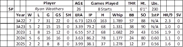In 2023, Weathers pitched well over seven starts for Miami at AAA (4-0 with a 2.54 ERA, 1.077 WHIP, and 38 strikeouts over 39.0 innings) after a midseason trade from San Diego. Unfortunately, he continued to struggle in the majors in 2023 (1-8 with a 6.55 ERA and 43 strikeouts over 57.2 innings).