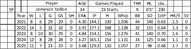 His average fastball (92.2 mph) was the lowest of his career. Taillon trusted his changeup (.167 BAA) more in 2025, while mixing in five other pitches – four-seamer (.222 BAA), cutter (.269 BAA), slider (.245 BAA), curveball (.161 BAA), and sinker (.232 BAA). He had a better approach to left-handed batters (four-seamer – .186 BAA, curveball – .167 BAA, and changeup – .169 BAA).
