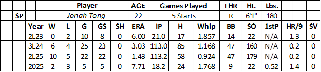 With the Mets, batters drilled him in three games (15 runs, 23 baserunners, and three home runs over 8.2 innings with eight strikeouts). Tong pitched well in his other two matchups (one run, 10 baserunners, and 14 strikeouts over 10.0 innings).