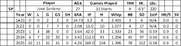 His average fastball (98.0 mph) was down about one mph from 2024. Soriano works primarily off his sinker (.289 BAA with 33 strikeouts and 50 walks) and curveball (.181 BAA with 50 strikeouts) while mixing in a split-finger (.137 BAA with 25 strikeouts), four-seamer (.220 BAA with 14 walks and 14 strikeouts), and slider (.273 BAA).
