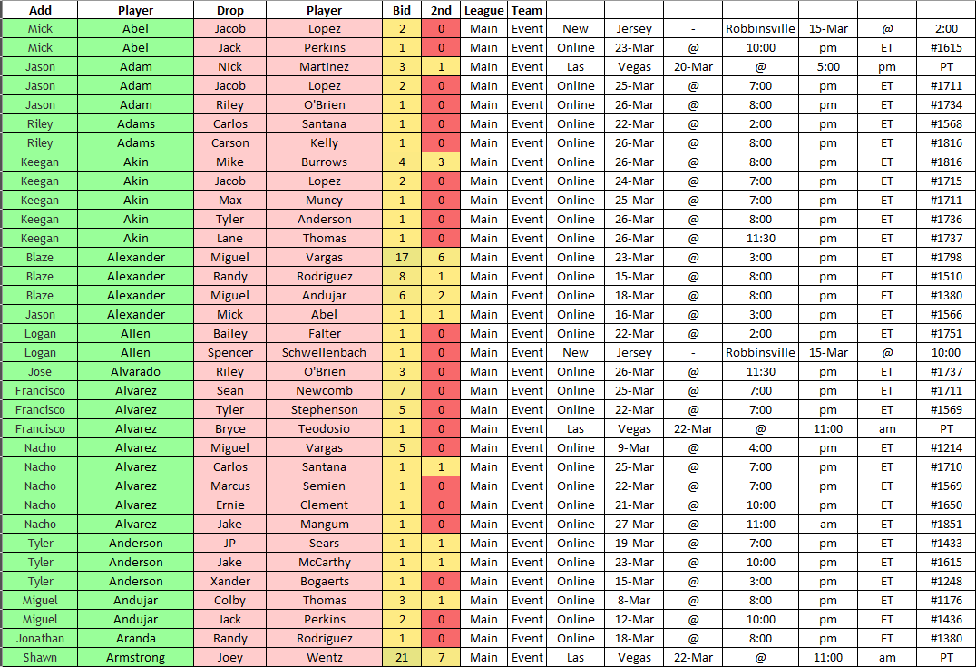 The link below shows this week’s player pickups and drops in the NFBC Main Event, along with their winning bids and the second-highest bids. I used the same Google Sheet as the Closer Depth Chart. By clicking the yellow link below, the free agent results show on the second tab. This information is accessible to all.