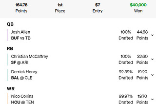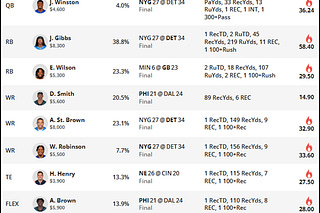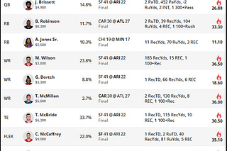 In Week 10, I drafted seven teams in Underdog’s Battle Royale, leading to $54 winnings for my $49 investment.
